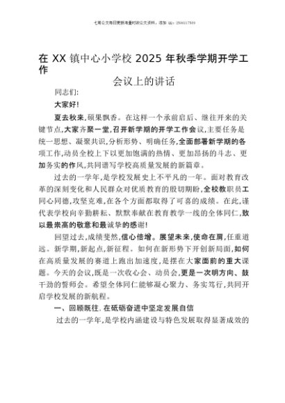 【七哥公文】2025年:在XX镇中心小学校2025年秋季学期开学工作会议上的讲话+更多免费公文+VX:QiGeGongWen2024
