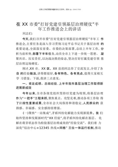 【七哥公文】2025年:在XX市委“打好党建引领基层治理硬仗”半年工作推进会上的讲话+更多免费公文+VX:QiGeGongWen2024