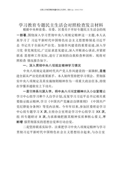 【七哥公文】2025年:贯彻中央八项规定精神学习教育专题民主生活会对照检查发言材料+更多免费公文+VX:QiGeGongWen2024