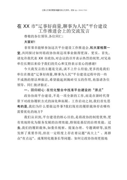 【七哥公文】2025年:在XX市“辽事好商量,聊事为人民”平台建设工作推进会上的交流发言+更多免费公文+VX:QiGeGongWen2024
