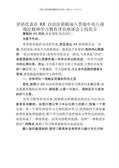 【七哥公文】2025年:评估代表在XX自治区侨联深入贯彻中央八项规定精神学习教育评估座谈会上的发言+更多免费公文+VX:QiGeGongWen2024