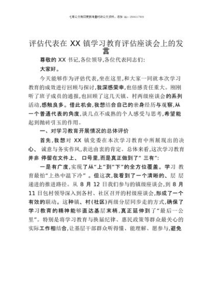 【七哥公文】2025年:评估代表在XX镇贯彻中央八项规定精神学习教育评估座谈会上的发言+更多免费公文+VX:QiGeGongWen2024