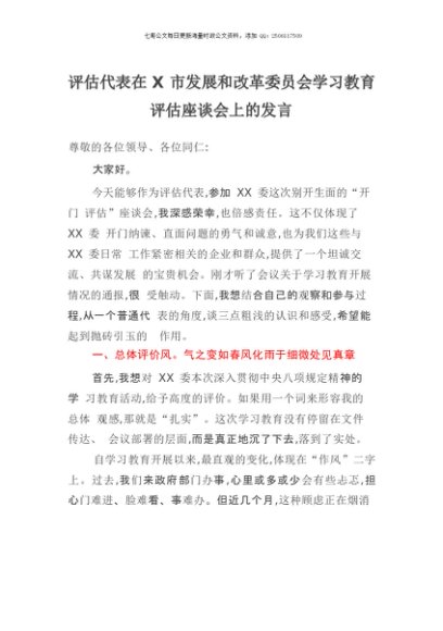【七哥公文】2025年:评估代表在X市发展和改革委员会贯彻中央八项规定精神学习教育评估座谈会上的发言+更多免费公文+VX:QiGeGongWen2024