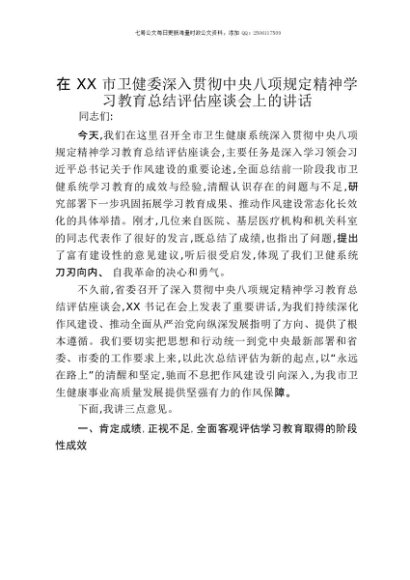 【七哥公文】2025年:在XX市卫健委深入贯彻中央八项规定精神学习教育总结评估座谈会上的讲话+更多免费公文+VX:QiGeGongWen2024