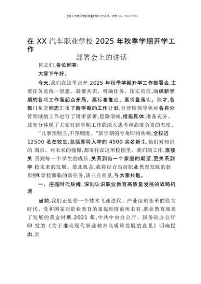 【七哥公文】2025年:在XX汽车职业学校2025年秋季学期开学工作部署会上的讲话+更多免费公文+VX:QiGeGongWen2024