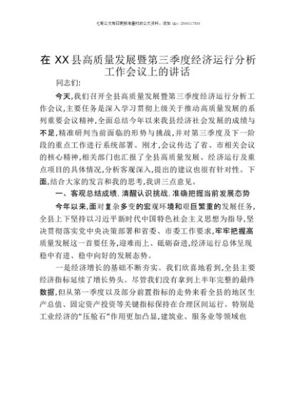 【七哥公文】2025年:在XX县高质量发展暨第三季度经济运行分析工作会议上的讲话+更多免费公文+VX:QiGeGongWen2024