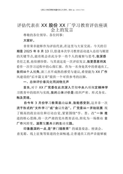 【七哥公文】2025年:评估代表在XX股份XX厂贯彻中央八项规定精神学习教育评估座谈会上的发言+更多免费公文+VX:QiGeGongWen2024