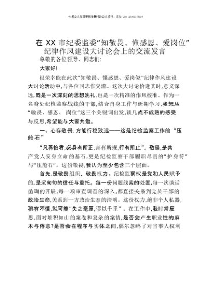 【七哥公文】2025年:在XX市纪委监委“知敬畏、懂感恩、爱岗位”纪律作风建设大讨论会上的交流发言+更多免费公文+VX:QiGeGongWen2024