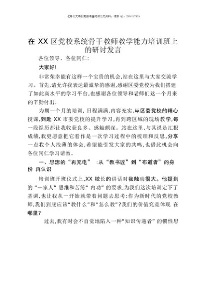 【七哥公文】2025年:在XX区党校系统骨干教师教学能力培训班上的研讨发言+更多免费公文+VX:QiGeGongWen2024
