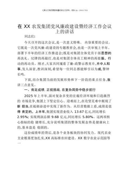 【七哥公文】2025年:在XX农发集团党风廉政建设暨经济工作会议上的讲话+更多免费公文+VX:QiGeGongWen2024