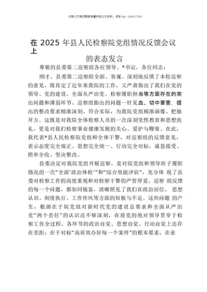 【七哥公文】2025年:在2025年县人民检察院党组情况反馈会议上的表态发言+更多免费公文+VX:QiGeGongWen2024