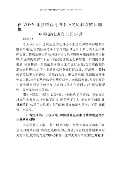 【七哥公文】2025年:在2025年县群众身边不正之风和腐败问题集中整治推进会上的讲话+更多免费公文+VX:QiGeGongWen2024