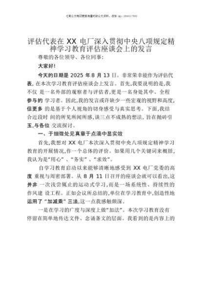 【七哥公文】2025年:评估代表在XX电厂深入贯彻中央八项规定精神学习教育评估座谈会上的发言+更多免费公文+VX:QiGeGongWen2024