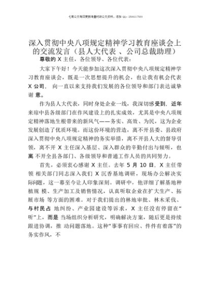 【七哥公文】2025年:深入贯彻中央八项规定精神学习教育座谈会上的交流发言(县人大代表、公司总裁助理)+更多免费公文+VX:QiGeGongWen2024