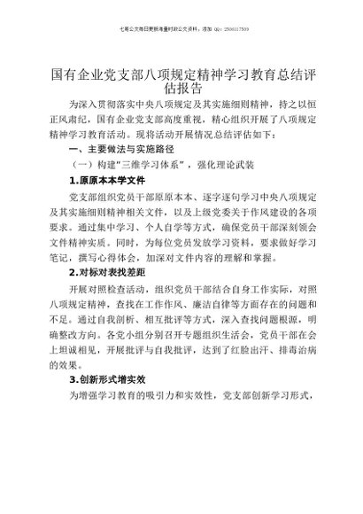 【七哥公文】2025年:国有企业党支部八项规定精神学习教育总结评估报告+更多免费公文+VX:QiGeGongWen2024