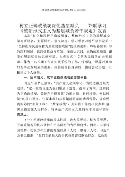 【七哥公文】2025年:树立正确政绩观深化基层减负——妇联学习《整治形式主义为基层减负若干规定》发言+更多免费公文+VX:QiGeGongWen2024