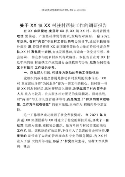 / 【七哥公文】2025年:关于XX镇XX村驻村帮扶工作的调研报告+更多免费公文+VX:QiGeGongWen2024