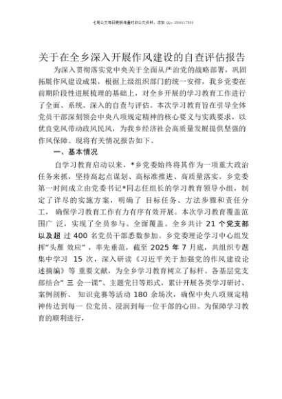 【七哥公文】2025年:关于在全乡深入开展作风建设的自查评估报告+更多免费公文+VX:QiGeGongWen2024