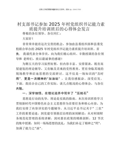 【七哥公文】2025年:村支部书记参加2025年村党组织书记能力素质提升培训班后的心得体会发言+更多免费公文+VX:QiGeGongWen2024