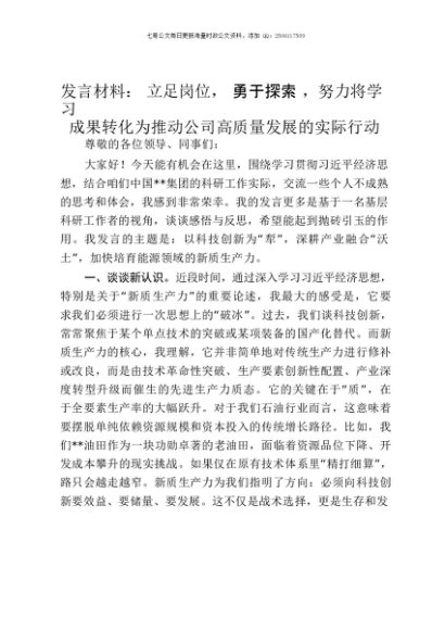 【七哥公文】2025年:发言材料:立足岗位,勇于探索,努力将学习成果转化为推动公司高质量发展的实际行动+更多免费公文+VX:QiGeGongWen2024