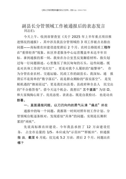 / 【七哥公文】2025年:副县长分管领域工作被通报后的表态发言+更多免费公文+VX:QiGeGongWen2024