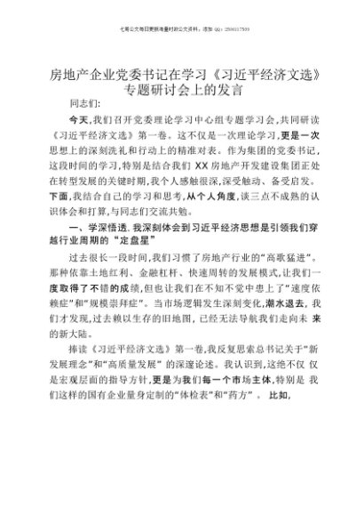 【七哥公文】2025年:房地产企业党委书记在学习《习近平经济文选》专题研讨会上的发言+更多免费公文+VX:QiGeGongWen2024