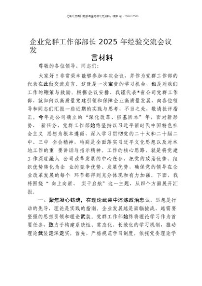 【七哥公文】2025年:企业党群工作部部长2025年经验交流会议发言材料+更多免费公文+VX:QiGeGongWen2024