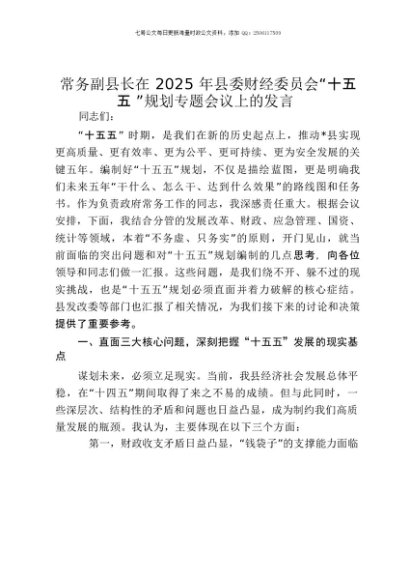 【七哥公文】2025年:常务副县长在2025年县委财经委员会“十五五”规划专题会议上的发言+更多免费公文+VX:QiGeGongWen2024