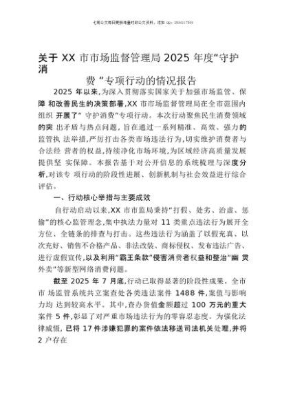 【七哥公文】2025年:关于XX市市场监督管理局2025年度“守护消费”专项行动的情况报告+更多免费公文+VX:QiGeGongWen2024