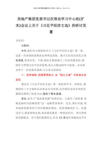 【七哥公文】2025年:房地产集团党委书记在理论学习中心组(扩大)会议上关于《习近平经济文选》的研讨发言+更多免费公文+VX:QiGeGongWen2024