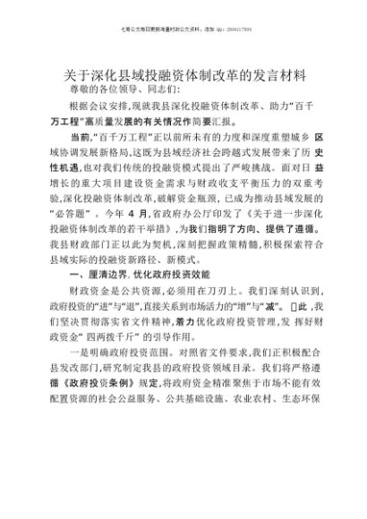 / 【七哥公文】2025年:关于深化县域投融资体制改革的发言材料+更多免费公文+VX:QiGeGongWen2024