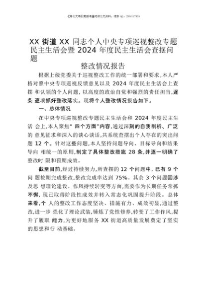 【七哥公文】2025年:XX街道XX同志个人中央专项巡视整改专题民主生活会暨2024年度民主生活会查摆问题整改情况报告+更多免费公文+VX:QiGeGongWen2024
