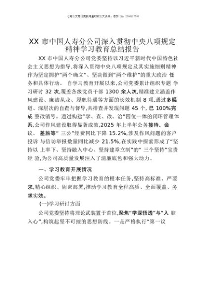 【七哥公文】2025年:XX市中国人寿分公司深入贯彻中央八项规定精神学习教育总结报告+更多免费公文+VX:QiGeGongWen2024