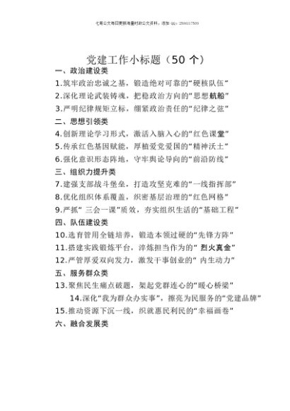 【七哥公文】2025年:党建工作小标题(50个)+更多免费公文+VX:QiGeGongWen2024