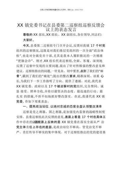 【七哥公文】2025年:XX镇党委书记在县委第二巡察组巡察反馈会议上的表态发言+更多免费公文+VX:QiGeGongWen2024