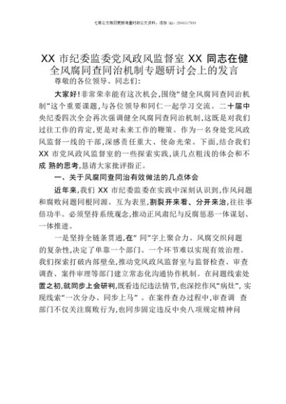 【七哥公文】2025年:XX市纪委监委党风政风监督室XX同志在健全风腐同查同治机制专题研讨会上的发言+更多免费公文+VX:QiGeGongWen2024