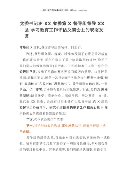 【七哥公文】2025年:党委书记在XX省委第X督导组督导XX县中央八项规定精神学习教育工作评估反馈会上的表态发言+更多免费公文+VX:QiGeGongWen2024