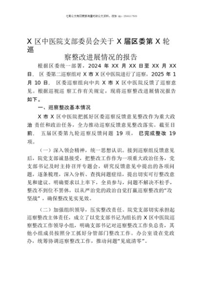 【七哥公文】2025年:X区中医院支部委员会关于X届区委第X轮巡察整改进展情况的报告+更多免费公文+VX:QiGeGongWen2024