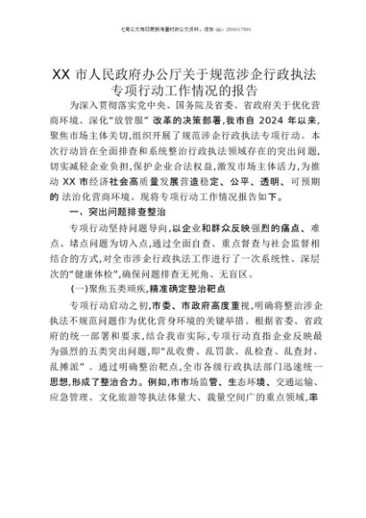 【七哥公文】2025年:XX市人民政府办公厅关于规范涉企行政执法专项行动工作情况的报告+更多免费公文+VX:QiGeGongWen2024