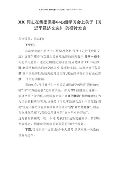 【七哥公文】2025年:XX同志在集团党委中心组学习会上关于《习近平经济文选》的研讨发言+更多免费公文+VX:QiGeGongWen2024