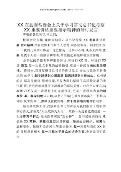 【七哥公文】2025年:XX在县委常委会上关于学习贯彻总书记考察XX重要讲话重要指示精神的研讨发言+更多免费公文+VX:QiGeGongWen2024