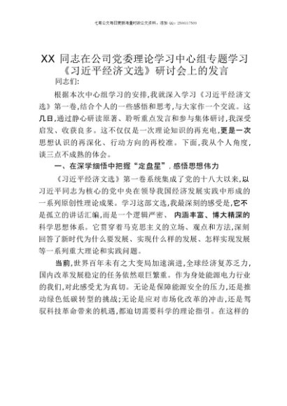 【七哥公文】2025年:XX同志在公司党委理论学习中心组专题学习《习近平经济文选》研讨会上的发言+更多免费公文+VX:QiGeGongWen2024