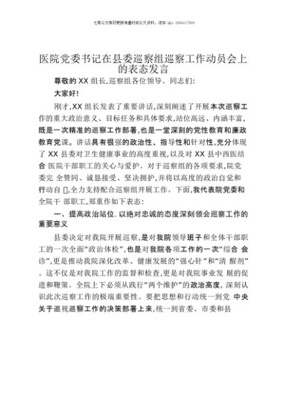 【七哥公文】2025年:XX县中西医结合医院党委书记在县委第X巡察组巡察工作动员会上的表态发言+更多免费公文+VX:QiGeGongWen2024