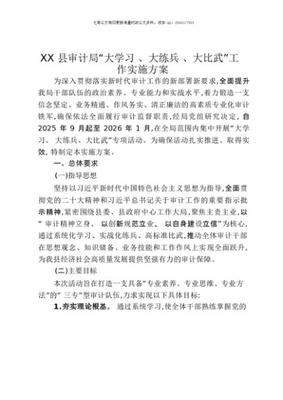 【七哥公文】2025年:XX县审计局“大学习、大练兵、大比武”工作实施方案+更多免费公文+VX:QiGeGongWen2024