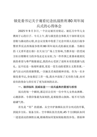 【七哥公文】2025年:镇党委书记关于观看纪念抗战胜利80周年阅兵式的心得体会+更多免费公文+VX:QiGeGongWen2024