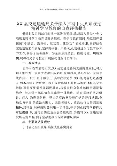 【七哥公文】2025年:XX县交通运输局关于深入贯彻中央八项规定精神学习教育的自查评估报告+更多免费公文+VX:QiGeGongWen2024
