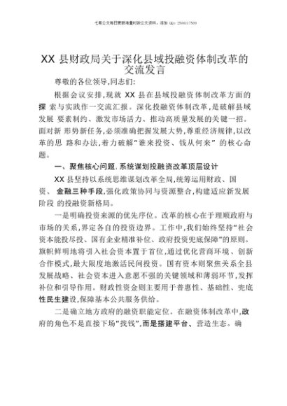 【七哥公文】2025年:XX县财政局关于深化县域投融资体制改革的交流发言+更多免费公文+VX:QiGeGongWen2024