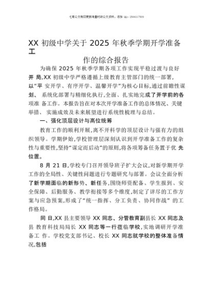 【七哥公文】2025年:XX初级中学关于2025年秋季学期开学准备工作的综合报告+更多免费公文+VX:QiGeGongWen2024