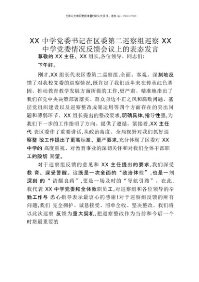 【七哥公文】2025年:XX中学党委书记在区委第二巡察组巡察XX中学党委情况反馈会议上的表态发言+更多免费公文+VX:QiGeGongWen2024