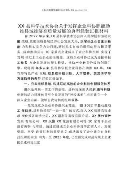 【七哥公文】2025年:XX县科学技术协会关于发挥企业科协职能助推县域经济高质量发展的典型经验汇报材料+更多免费公文+VX:QiGeGongWen2024